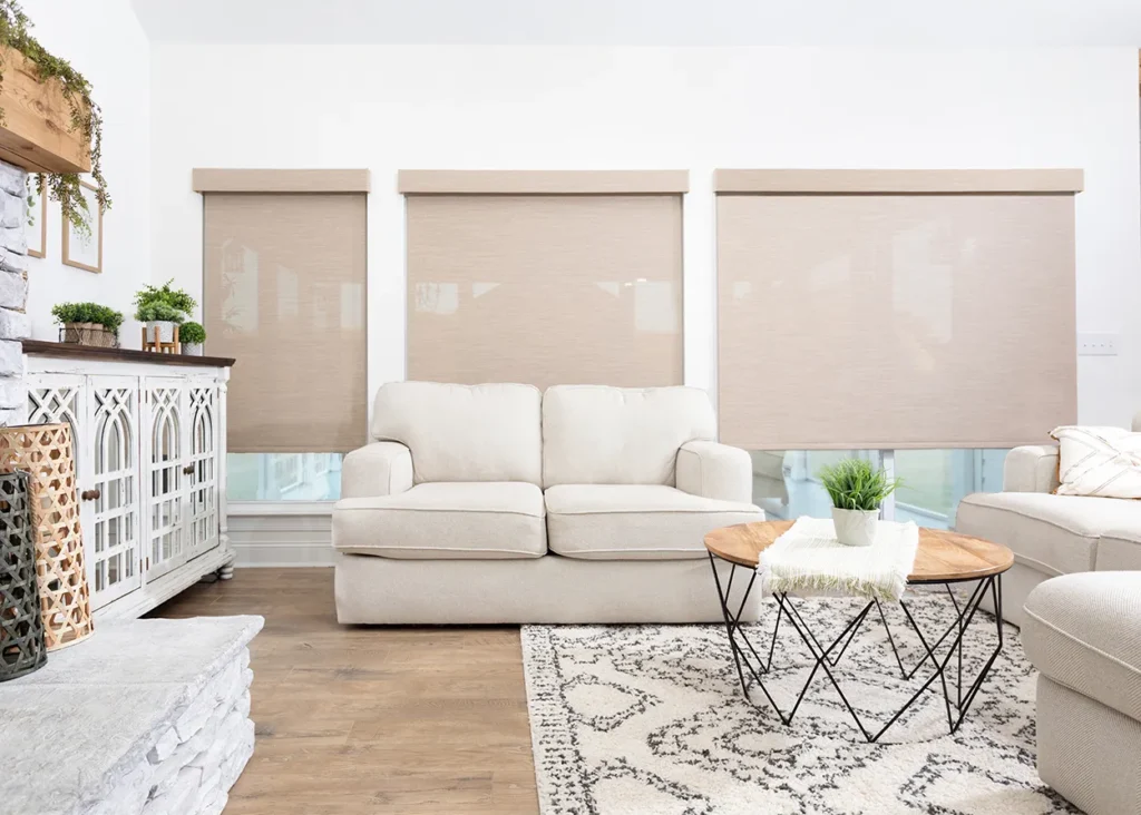 Roller shades are a type of window treatment made from a single piece of fabric that rolls up and down on a cylindrical tube. They operate using a manual spring system, or motorized control, making them an easy-to-use, space-saving solution for managing light, privacy, and style.